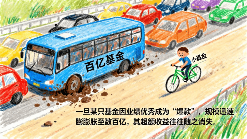 一旦某只基金因业绩优秀成为“爆款”,规模迅速膨胀至数百亿,其超额收益往往随之消失。