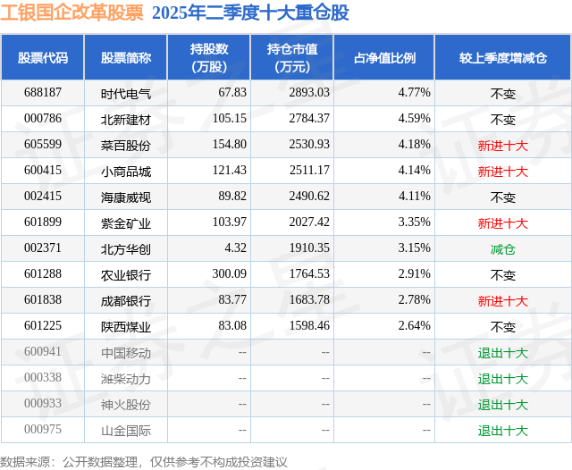 根据2025基金半年报公募基金重仓股数据,重仓该股的公募基金共8家,其中持有数量最多的公募基金为工银瑞信基金的工银国企改革股票。工银国企改革股票目前规模为6.06亿元,最新净值2.446(9月30日),较上一交易日上涨0.2%,近一年上涨18.91%。该公募基金现任基金经理为何肖颉。何肖颉在任的基金产品包括:工银核心价值混合A,管理时间为2014年3月6日至今,期间收益率为190.89%;工银生态环境股票A,管理时间为2015年6月2日至今,期间收益率为152.2%;工银价值成长混合A,管理时间为2022年3月23日至今,期间收益率为13.57%。