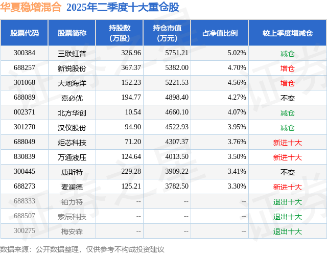 根据2025基金半年报公募基金重仓股数据,重仓该股的公募基金共6家,其中持有数量最多的公募基金为华夏基金的华夏稳增混合。华夏稳增混合目前规模为11.46亿元,最新净值3.268(9月30日),较上一交易日上涨1.3%,近一年上涨51.93%。该公募基金现任基金经理为彭海伟。彭海伟在任的基金产品包括:华夏景气成长一年持有混合发起式A,管理时间为2024年3月28日至今,期间收益率为60.37%。