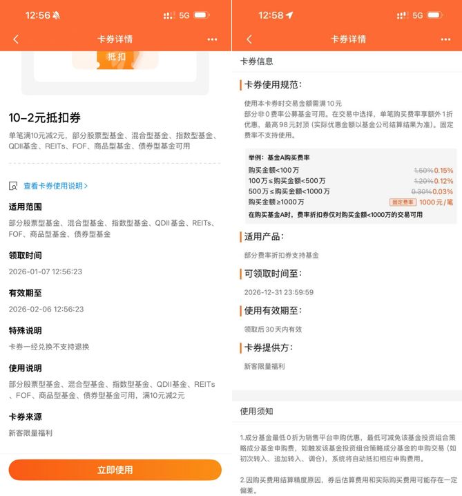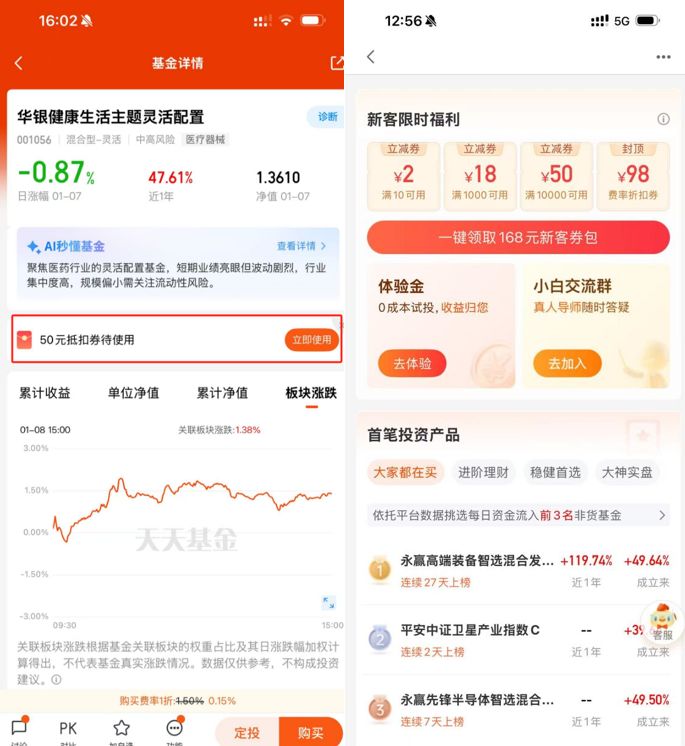 比如,在华银健康生活主题灵活配置的详情界面中,有“50元抵扣券待使用”的红包提示,在另一些基金的详情页面中也有类似标识。针对这些卡券的使用,平台方也在详情中注明须知,其中包括,用户在财富号学习理财知识即可获得一定金额的卡券。