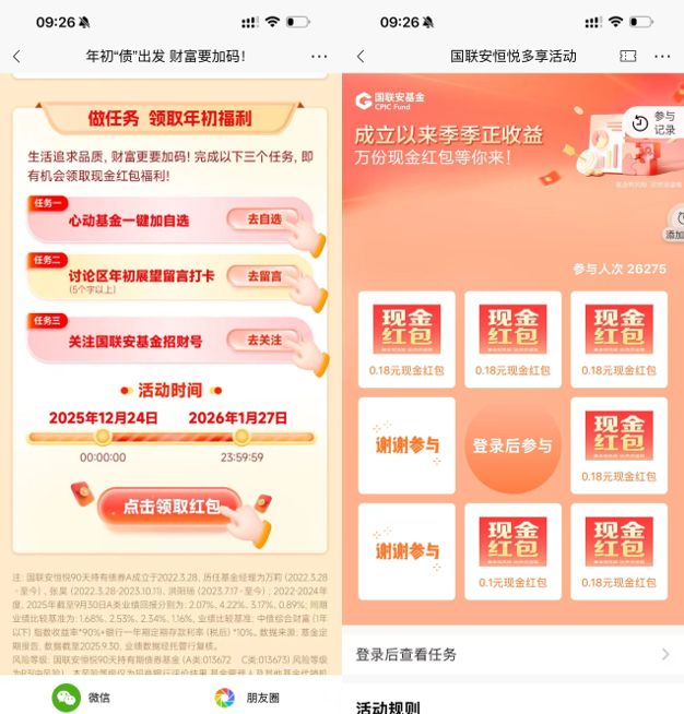 根据介绍,领取福利需要完成三个任务,才有机会领取现金红包。任务包括将心动基金一键加自选、讨论区年初展望留言打卡、关注国联安基金招财号。红包金额并不算大,但参与人次已经多达26277人。