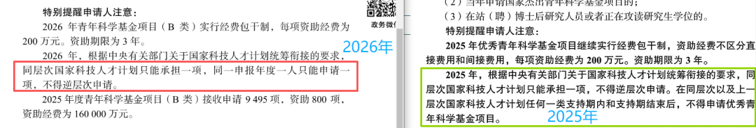 2026年,根据中央有关部门关于国家科技人才计划统筹衔接的要求,同层次国家科技人才计划只能承担一项,同一申报年度一人只能申请一项。在青年科学基金项目(B类)及其同层次国家科技人才计划任何一类支持期内,不得申请青年科学基金项目(A类),但资助期满当年可以申请。