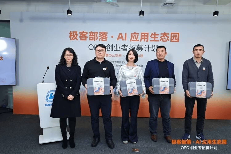 活动现场还为首批具备入驻极客部落意愿的 OPC 创业者代表颁发“朝阳区创业大礼包”,该礼包整合政策扶持、办公资源与生态服务,旨在降低创业门槛,提升创业成功率,助力更多 AI 创业项目快速成长。包括 Lovstudio.ai 创始人手工川、数乘科技联合创始人徐建明等在内的多位创业者获得支持。