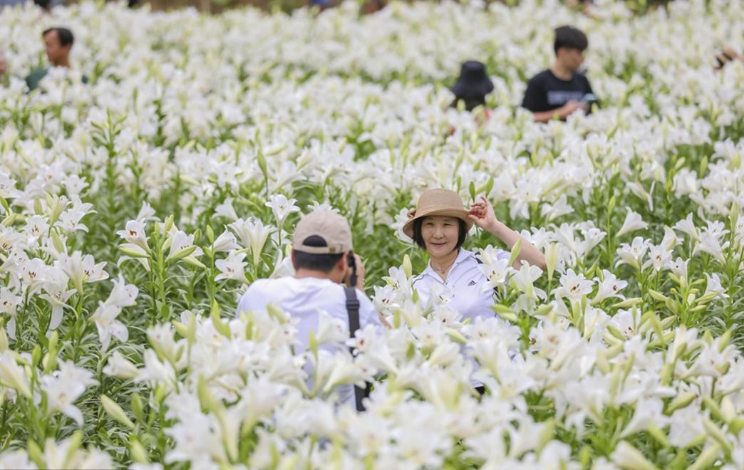 游人在闽侯县荆溪镇桃田村百合花田游玩(资料图)。新华社发(谢贵明 摄)