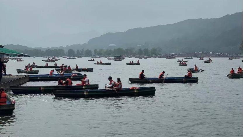 10月1日中午,一艘载满游客的三层游轮从杭州西湖断桥边缓缓开出,附近的湖面上,分布着密密麻麻的手摇船,网友戏称“今天西湖被游船给攻占了”。