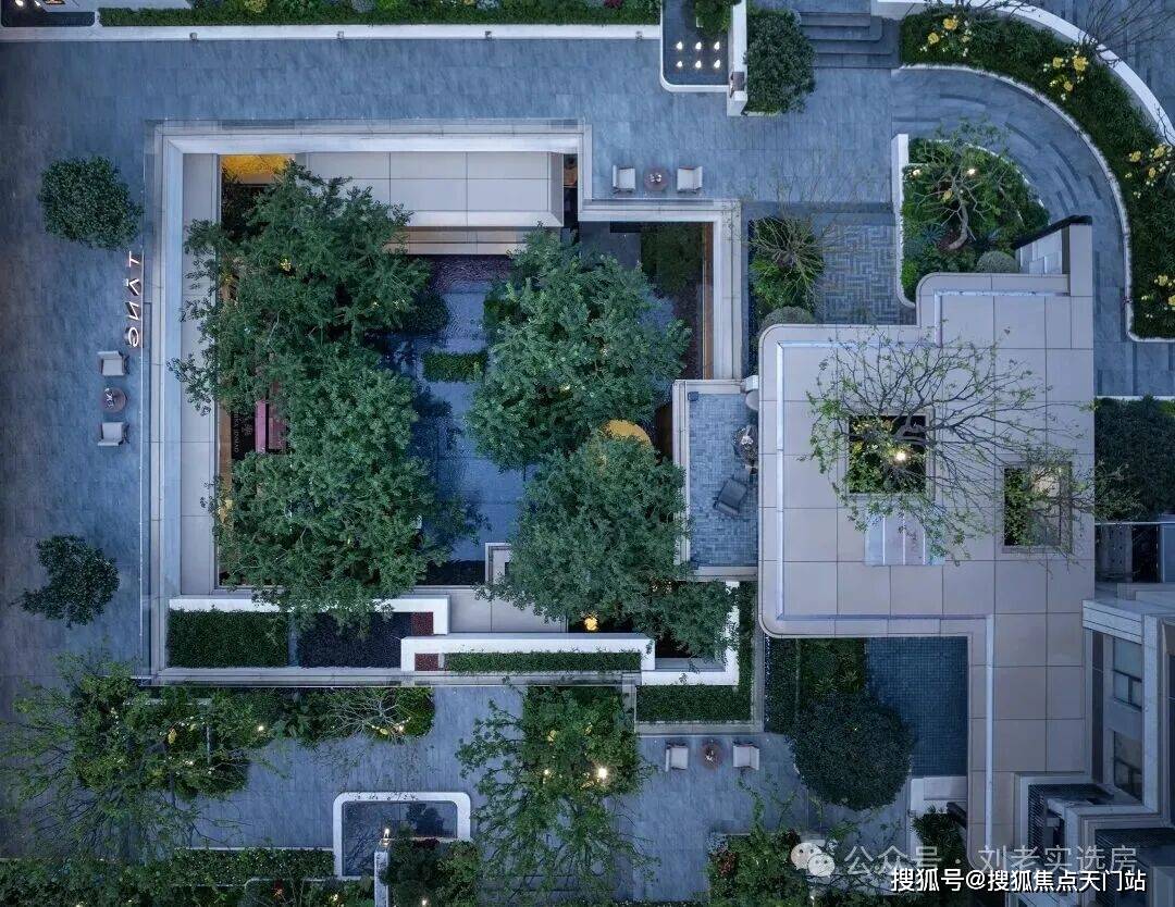 项目北入口社区大堂、下沉会所、下沉庭院与架空层泛会所联合打造社区共享客厅,以折型风雨廊围合庭院空间。