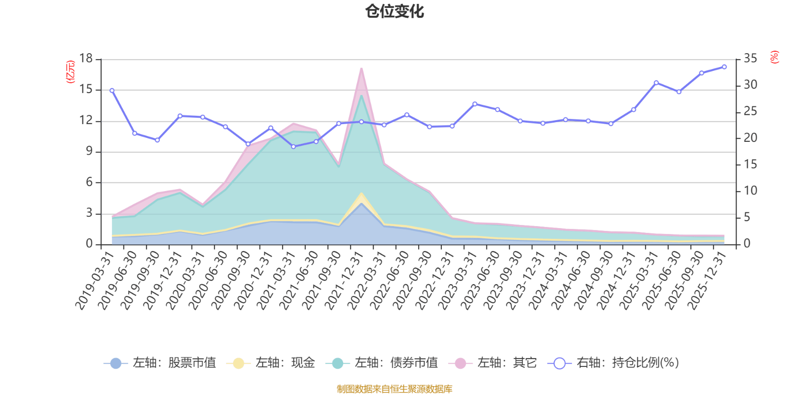 据定期报告数据统计,近三年平均股票仓位为26.56%,同类平均为72.57%。2025年末基金达到33.54%的最高仓位,2021年一季度末最低,为18.48%。