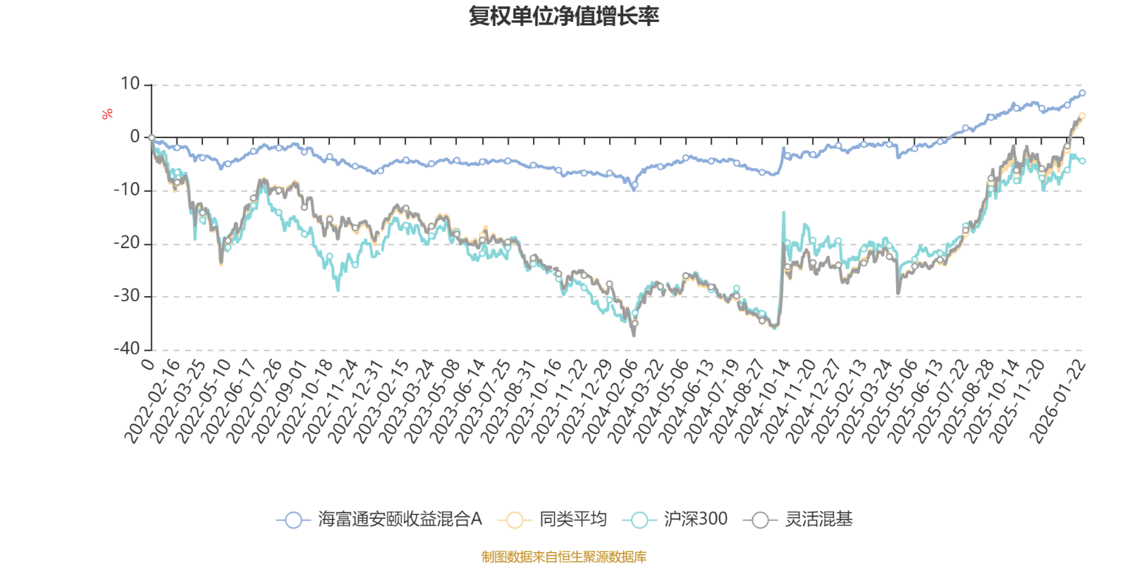截至1月22日,海富通安颐收益混合A近三个月复权单位净值增长率为2.82%,位于同类可比基金989/1286;近半年复权单位净值增长率为6.46%,位于同类可比基金1024/1286;近一年复权单位净值增长率为10.53%,位于同类可比基金1080/1286;近三年复权单位净值增长率为13.63%,位于同类可比基金703/1286。